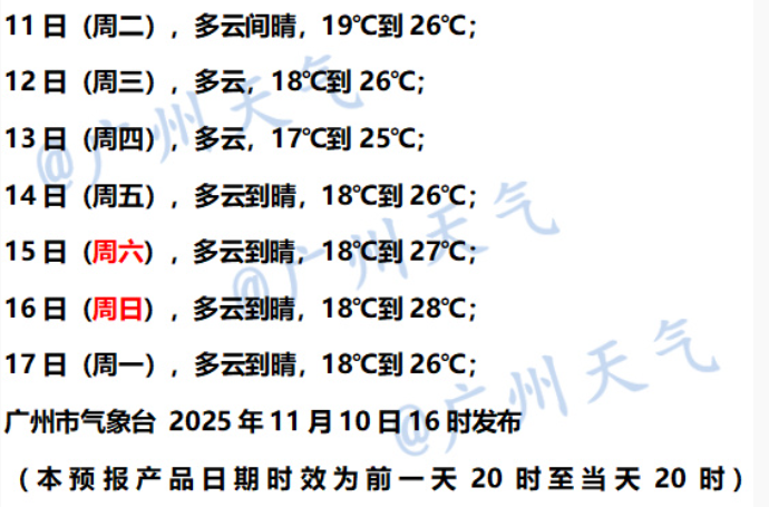 11月11日—12日,东部偏东市县多云转小到中雨局部暴雨,其余市县晴到多云。最低气温:粤北偏北、肇庆和云浮北部市县14~16℃,南部沿海市县19~22℃,其余市县17~19℃。